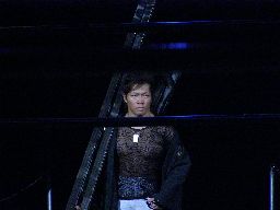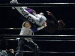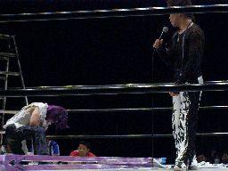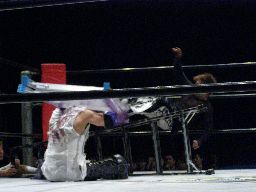 怨霊突っ込む、MIKAMIショルダースルーで場外に落とす。MIKAMIはイスを積み上げてその上に怨霊を乗せると客席の仕切りのフェンスから飛んでセントーン(右写真)。