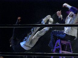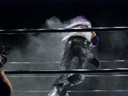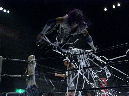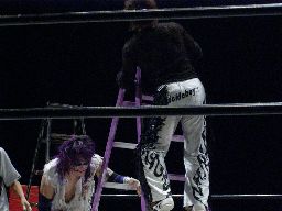 怨霊はリング上にラダーを2つ立て、真ん中に立つ(右写真)。そこからの怨霊ドライバー狙うがMIKAMI飛びついてウラカンホイップ。逆にラダーに上ると後頭部にミサイルキック。