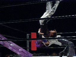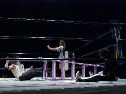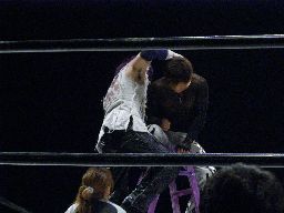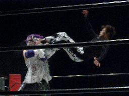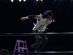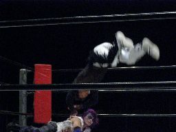 MIKAMIがコーナーに上ると怨霊は背後からドロップキック、MIKAMIを場外に落としてプランチャ(左写真)、MIKAMIかわす。
