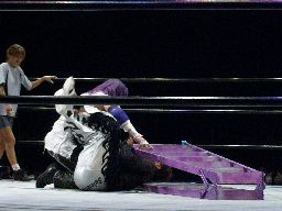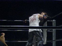 MIKAMIリングに戻るとトペ・コン・ヒーロ(右写真)。飛びすぎてフェンスにアバラをぶつける。
