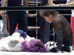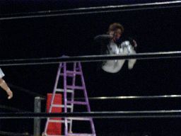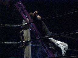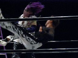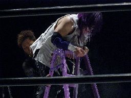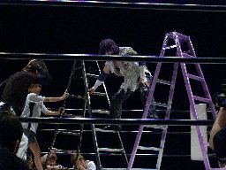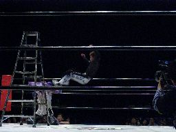 両者ラダーに上る、てっぺんでパンチの打ち合い(右写真)。怨霊雪崩式フランケン、カウント2。