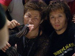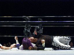 MIKAMIロープに振る、怨霊切り返す、MIKAMIコルバタ(右写真)。怨霊場外転落、リング下に消える。