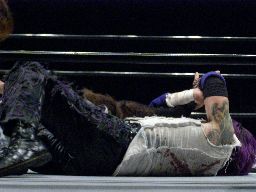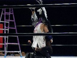 再度ラダー頂上での攻防、怨霊はMIKAMIの顔をつかんで飛び降りラダーのステップにMIKAMIの顔面を叩きつける(右写真)。