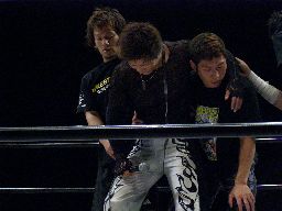 SUSUMU、高梨の肩を借りてようやく立ち上がるMIKAMI(左写真)。
