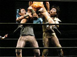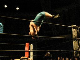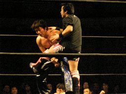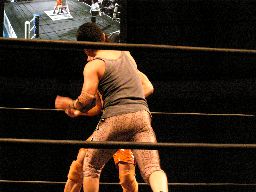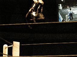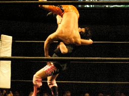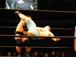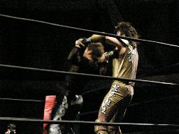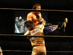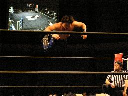 アメバルコーナーに上る、高木立ち上がってパワーボムに行く(右写真)がアメバルはウラカン・ラナに切り返す。