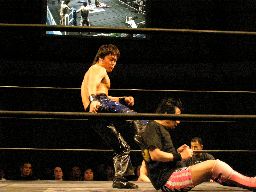 MIKAMI首投げからセントーン、カウント2。フェースカットからブーメラン狙うが塩蛇ん起き上がらない(左写真)。