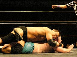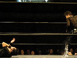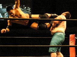 ロープに振ってダブルのエルボーから蛇イ〜ン、再度ロープに振ってダブルのフラップジャック(右写真)、ポイズンがカバー、カウント2。