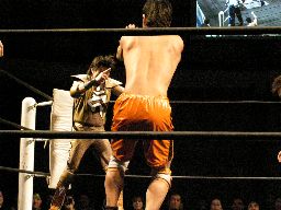 塩蛇んロープに飛ぶ、高梨カウンターのトラースキック(左写真)、HARASHIMAにタッチ。