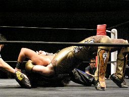 MIKAMIとポイズンはコーナーを使っての攻防。ポイズンが蛇界ノクラズム狙う、MIKAMI着地(左写真)。MIKAMIスイングDDT狙う、ポイズンブロックしてコーナーに戻す。MIKAMIエプロンに出てブーメラン式のキックをボディに入れる。