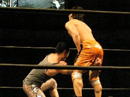 塩蛇んニールキック、コーナーに振って串刺しニーアタック。フィッシャーマンバスター(右写真)、カウント2。