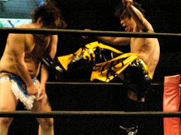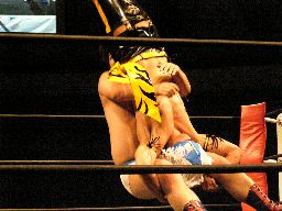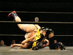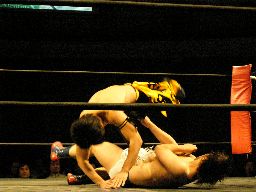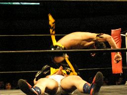 ロックアップ、KUDOアームホイップ。再度ロックアップ、ディーノ股間狙う、KUDOは前方回転で逃げる(右写真)。