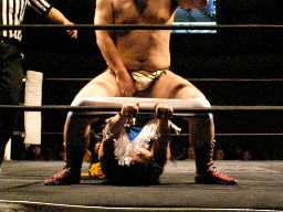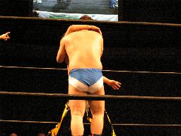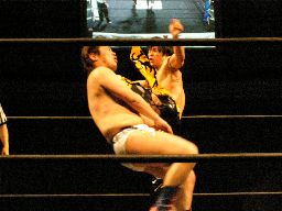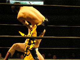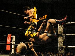コーナーに上ってダイビングダブルニーアタック(右写真)、カウント2。