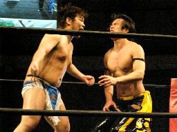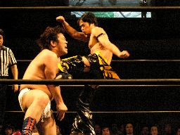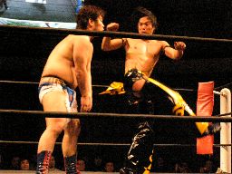 ディーノタッチ、KUDO腕を取ってアームホイップ(左写真)。