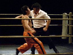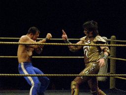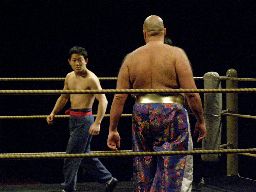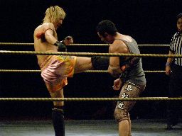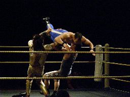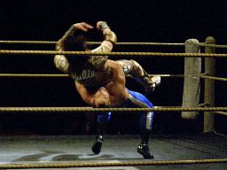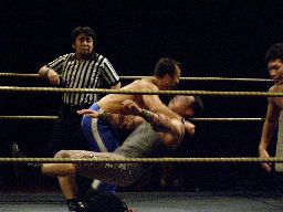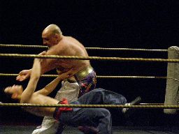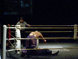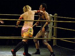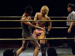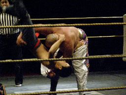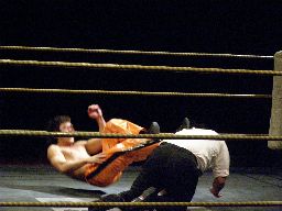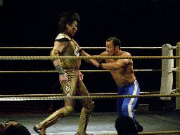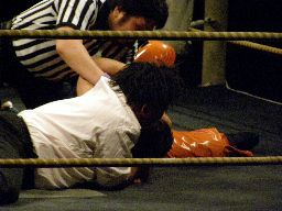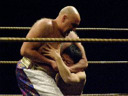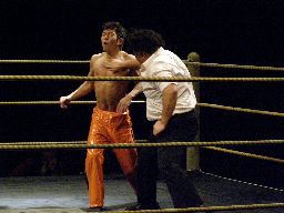 2回目には星誕期「組めオラー!」と怒りの声を上げる。3度目趙雲意を決してロックアップ、星誕期は投げ飛ばす。趙雲は星誕期をかわして足をすくおうとするが背中にパンチを浴びる(左写真)。星誕期ヘッドロック。締め上げてリリース。