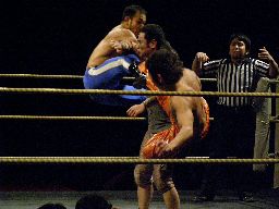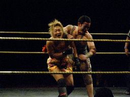 趙雲スワンダイブミサイルキック、カバー、カウント1。趙雲トップロープからダイブ、星誕期キャッチしてノド輪落としに、趙雲ブロックしてスクールボーイに、星誕期押しつぶす。星誕期ノド輪落とし(左写真)