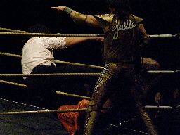 するとそこにマイケルのテーマが流れる。花道から必要以上にテカテカしたマイケルがリングに(左写真)。「おい!俺はこないだの試合で決着がついたなんて思っちゃいねえんだよ!なんだったら今ここで決着つけようか?お前の得意なノド輪落としかけてみろよ!」