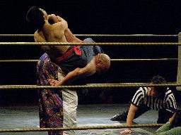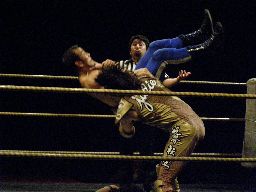 最後はカナディアンバックブリーカーで担ぎ上げてアルゼンチンバックブリーカーにスイッチ(右写真)、趙雲ギブアップ。