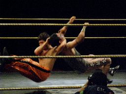 セカンドコーナーに上ってダイビングプレス(右写真)、カウント2。