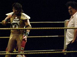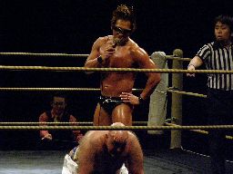 高梨チョップ連打するが福蛇には効かず。福蛇逆水平一発(左写真)で倒す。福蛇ストンピング、立たせて背中に腕パンチ。