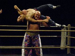 晴也は福蛇、ポイズン、魔蛇美にクォーラルボンバー3連発。福蛇にもう一発、福蛇耐える。晴也ロープに飛ぶ、福蛇ラリアット、晴也かわしてクォーラルボンバー(右写真)。