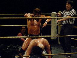 そしてエルボースマッシュ(右写真)、福蛇にタッチ。鳥羽も高梨にタッチ。鳥羽はリング下で手当。急所にモロ入っちゃったようだ。