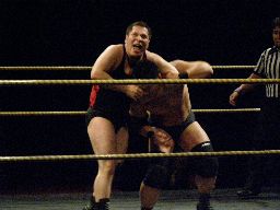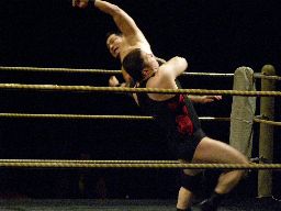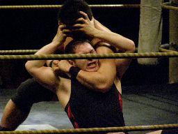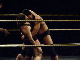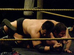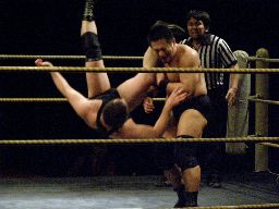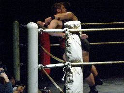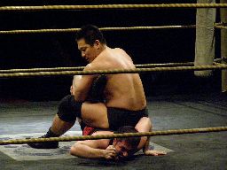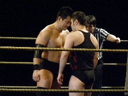 パンチの応酬でスタート(右写真)。ロープワークからショルダーブロック、かすった感じに。さらにロープワーク、アントンキャッチして首投げからスリーパー、高木切り返して腕をひねる。アントン切り返すが高木はさらに切り返す。
