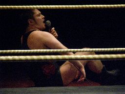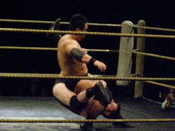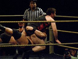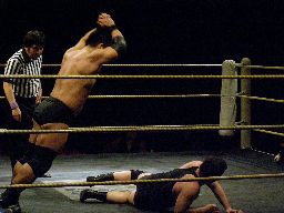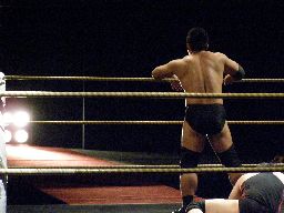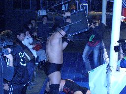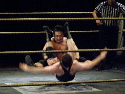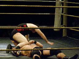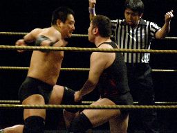 対角線に振って突っ込む、高木カウンターのドロップキック(右写真)。高木ロープに振ってキチンシンク。倒れたアントンにストンピング連打、カバーはカウント1。
