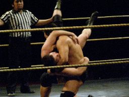 アントンヘッドロック(左写真)、高木はバックドロップに、カウント2。アントンアリキック連打、高木ジャンプしてかわすとそのままアントンにニードロップ、カウント2。10分経過。