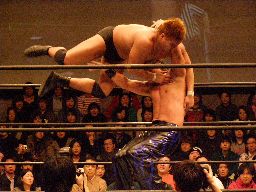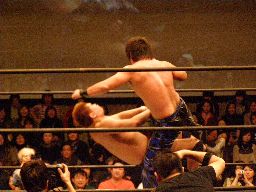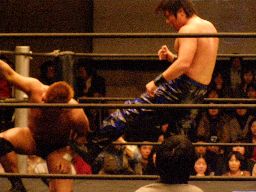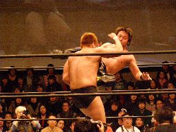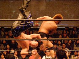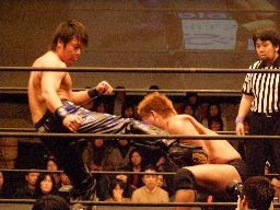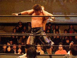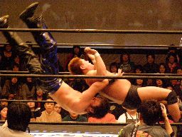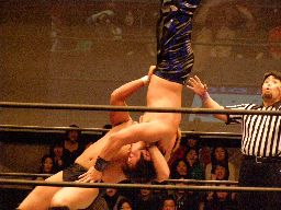 HARASHIMAロープに飛ぶ、柿本キャッチして水車落とし(右写真)。柿本ラリアット、HARASHIMAかわすが柿本一回転してラリアット。カウント2。