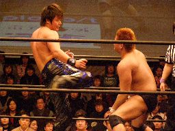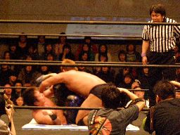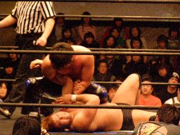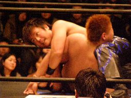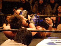 HARASHIMAファルコンアロー狙う、柿本ブロックして逆に投げようとするがHARASHIMAはワキ固め(右写真)に。柿本ロープ。