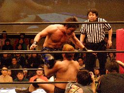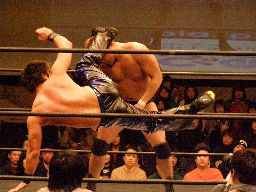 柿本コーナーに振って串刺しエルボーからコーナーに上ってミサイルキック(左写真)、カウント2。