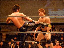 エルボーの打ち合い、HARASHIMA水面蹴り(右写真)で柿本の体勢を崩すとシャイニングウィザード、カウント2。