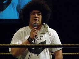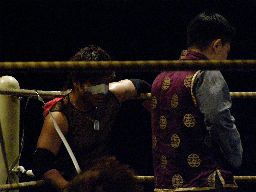 矢郷コーナーに振ってラリアット、ストンピング、首投げからサッカーボールキック連打(右写真)。矢郷ロープに飛ぶ、MIKAMIカニばさみで倒してセントーン、趙雲にタッチ。