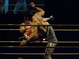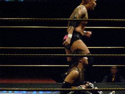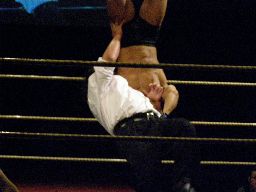 MIKAMIコーナーに上るが矢郷が捕まえる(右写真)。MIKAMIは振り切って450に行くが高木はキャッチしてシットダウンパワーボムに、カウント2。