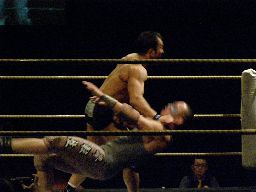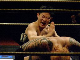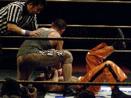 趙雲ソバット、コーナーに上って「不法取調反対!」と叫んで片足ミサイルキック、カウント2。ソバット連打からロープに飛ぶ、高木はサンシローズライン。高木のサンダーファイヤーパワーボムを趙雲は回転エビ固めに(右写真)、カウント2。趙雲中国式619、MIKAMIにタッチ。MIKAMIもミッキーブーメランで続く。