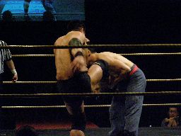 趙雲ロープに振る、矢郷切り返してかわづ落とし(右写真)。ターンバックルに背中から2度叩きつける、高木にタッチ。5分経過。