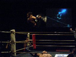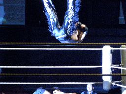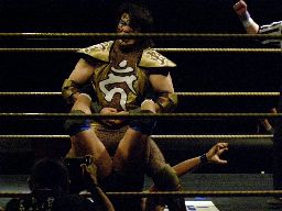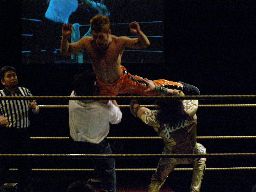 MIKAMI首投げ、コーナーに上ってダイビングセントーン(右写真)。自分の受身でも鼻に衝撃が来そうだな。カバーはカウント2。10分経過。