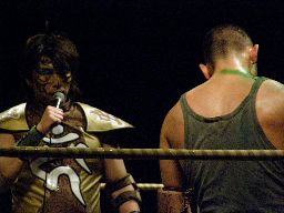 マッスル坂井がリザーブ池田を連れてリングに(左写真)。「先週の金曜日各マスコミに対し大鷲選手復帰か?のリリースを送りました。しかし一切の許可を取っていません。なぜならば連絡先がわからないからです。マイミク申請してもレス返ってこないし。まあプロレス界ではこういう事後承諾はよくあることです。むしろ直接リリースを見せつけることにより大鷲背乳にとってもいい方向に作用すればと。おい池田、アンタはぴあの社員でありながら大鷲選手の個人的マネジャーもやってるな?ぴあから給料をもらいながら大鷲選手からも給料をもらってる。二重取りだ。大鷲選手の連絡先、知ってるんだろ?」