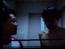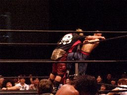 猪熊ロープに振ると寝っ転がって下からパンチ。猪熊がラリアットで726を場外に落とす(左写真)。