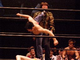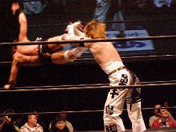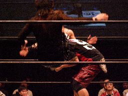 趙雲と藤岡が入る。ダブルでロープに振ってガットショットで倒すと趙雲がサマーソルトドロップ、藤岡がジャンピングボディプレス(左写真)、カウント2。