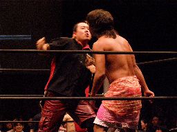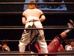 チョップの打ち合い(右写真)。猪熊飛びつきDDT。