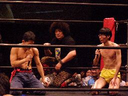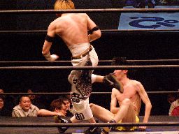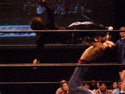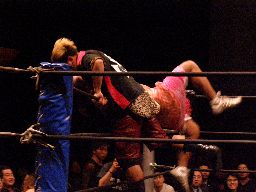 趙雲がコーナーからダイブ、isamiが下からドロップキックで迎撃(左写真)。