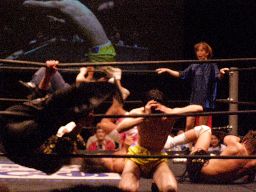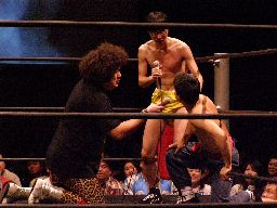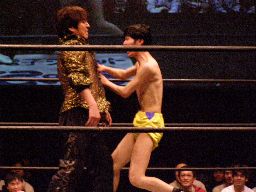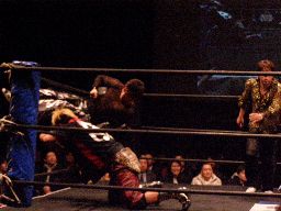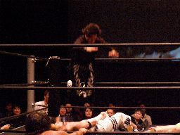 猪熊が入ってダブルのガットショット、ロープに振ると猪熊寝っ転がってパンチ(右写真)、ゴージャスがクロスアタック。2人で手をつないでハイファイヴエルボードロップ、カウント2。