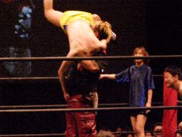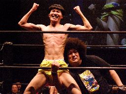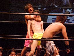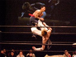 SUSUMUが趙雲を肩に担いでジャンピングスラム(右写真)。