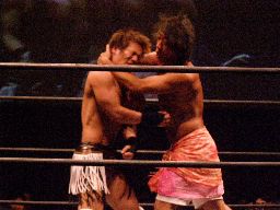 ゴージャスと藤岡がリングに。エルボーの打ち合い(右写真)。