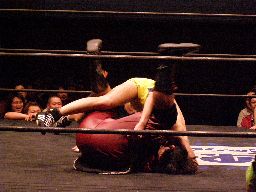 726が入ってパンチ、ガットショットからロープに飛んでフェイマッサー(右写真)、isamiがドロップキック、カウント2。