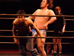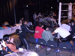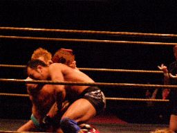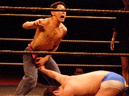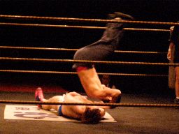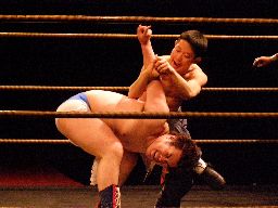 ディーノストンピング、ロープに飛んで男色クロー、趙雲は脚でキャッチすると(右写真)シザーズホイップ、ディーノは場外転落。趙雲はコーナーに駆け上って場外への片足ミサイルキック。ディーノは会場にいたさくらえみや真琴に突っ込んでいく。趙雲がリングに戻す。