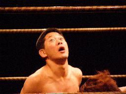 ディーノバック取って趙雲を蹂躙(左写真)。趙雲がロープに逃げようとするがディーノはフルネルソンからひっくり返してさらに触る。趙雲ロープ。