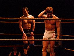 そこにヌルヌルブラザーズが登場。マイケル「モロさん、社長に媚売って、ついでにブログでチケット売って社長に取り入ろうってハラですか?しかし、何があろうと俺たちはこのベルトは手放さない!このベルトを持ってプロレス界の甘い汁を吸い尽くしてやるんだ!」
