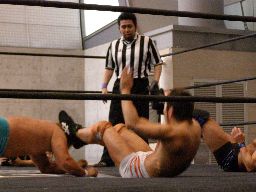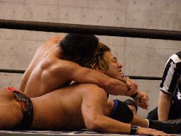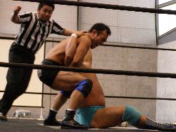 高梨再度タカタニック、マイケルブロック、ロープ際まで飛んだ高梨に松永がイス攻撃、そしてマイケルがスクールボーイ(左写真)、カウント3。
